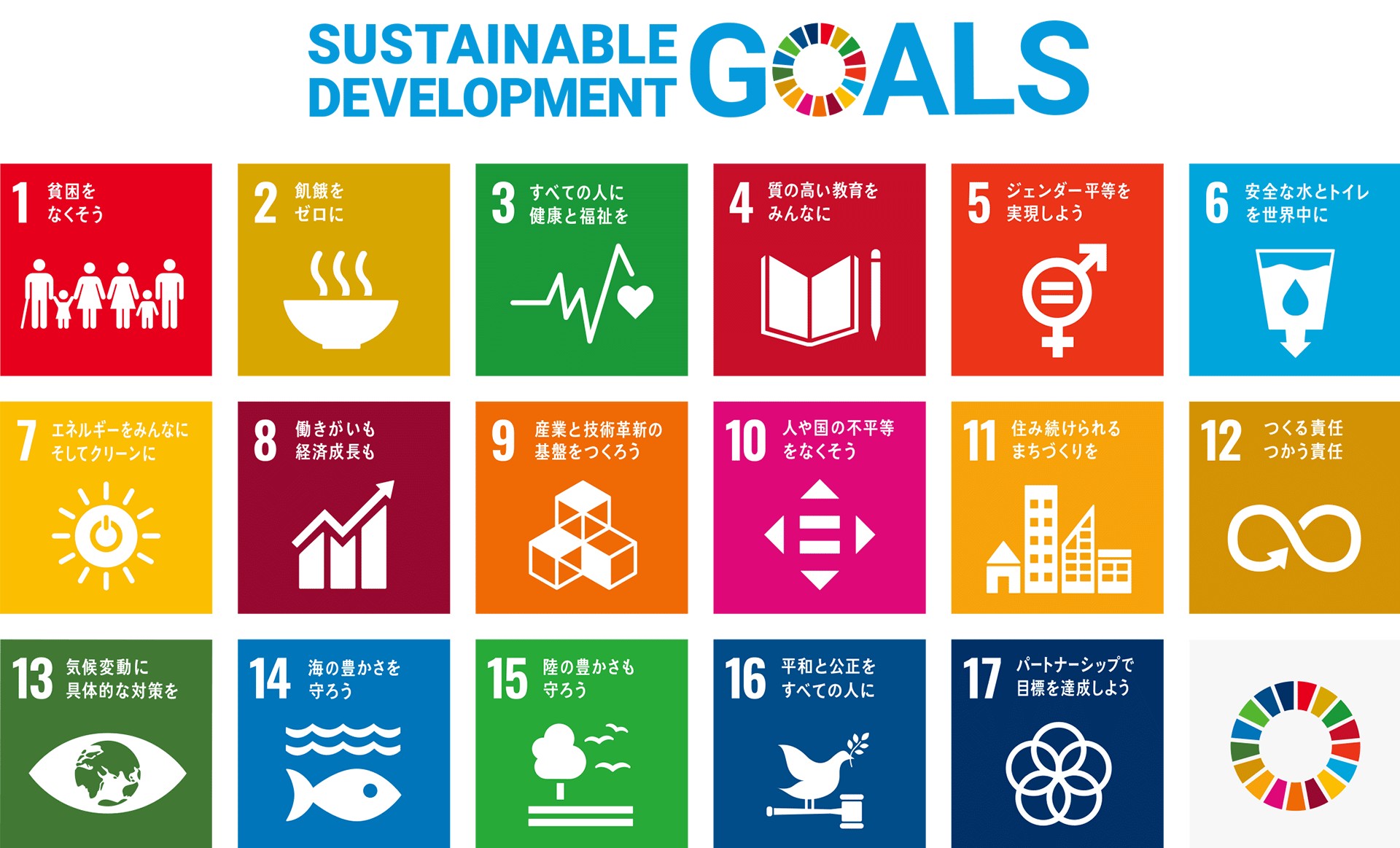 「Sustainable Development Goals」の略称であり、日本語で“持続可能な開発目標"という意味になります。持続可能な社会をつくるために、世界が抱える17の目標と169のターゲットに整理したもの(2015年9月に国連で採択)。2030年までに、政府、企業、地域社会のあらゆる人が、SDGSを実現するための役割を担っています。